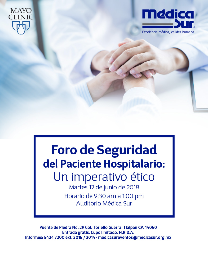 Tomando como eje una de las principales misiones que tenemos en la Institución, que es mantener en todo momento la seguridad de nuestros pacientes; Médica Sur en conjunto con la Mayo Clinic realizó el pasado 12 de junio el Foro de Seguridad del Paciente Hospitalario: Un imperativo ético.