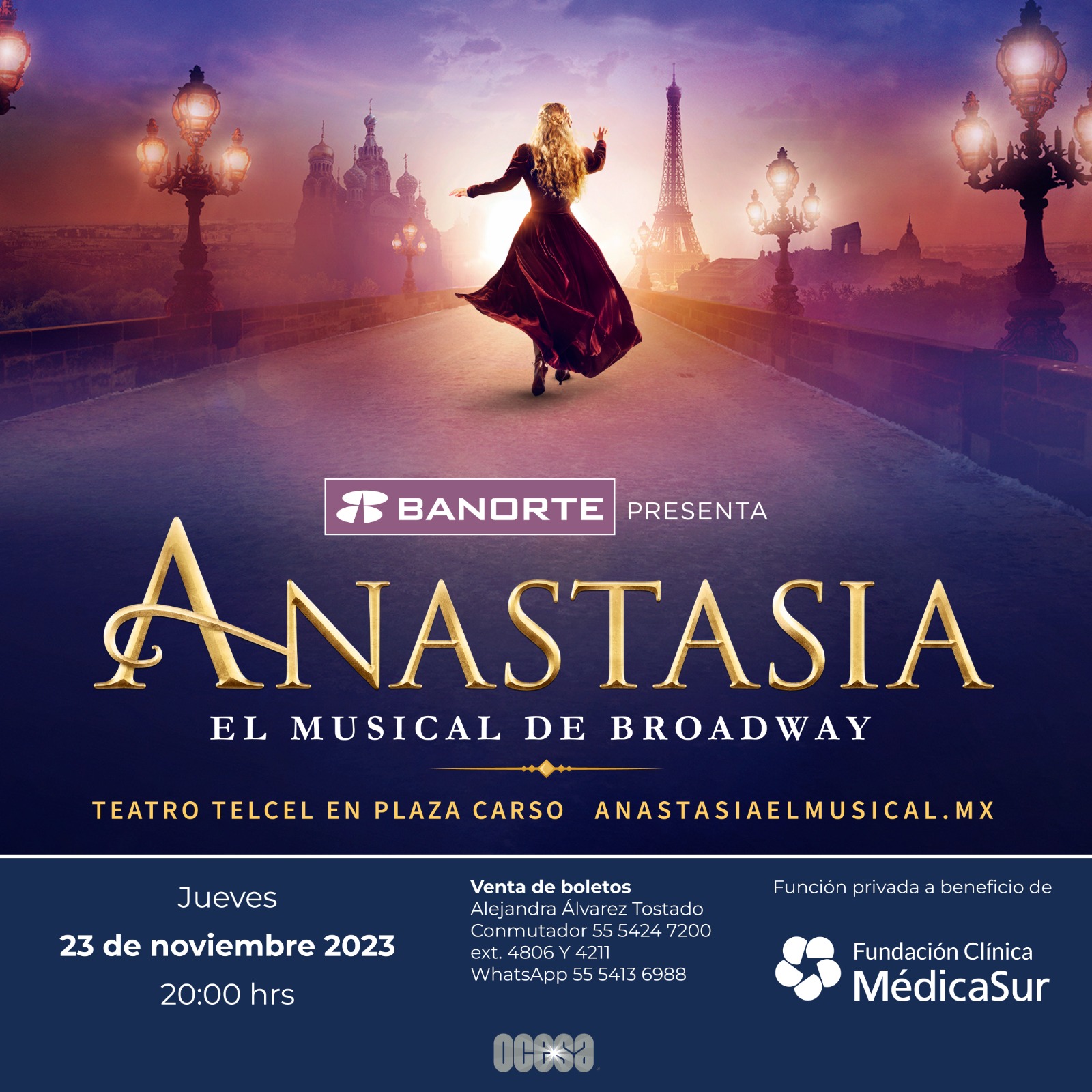 Fundación Clínica Médica Sur, te invita a la función privada ANASTASIA -el gran musical de Broadway- que se llevará a cabo el jueves 23 de noviembre a las 20:00 horas en el Teatro Telcel ubicado en Plaza Carso.